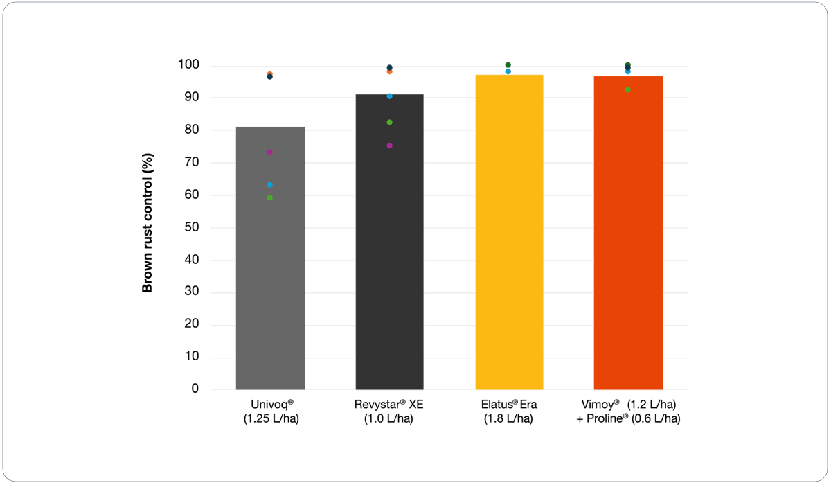 Barchart showing Vimoy + Proline provides more control against Yellow rust than Elatus